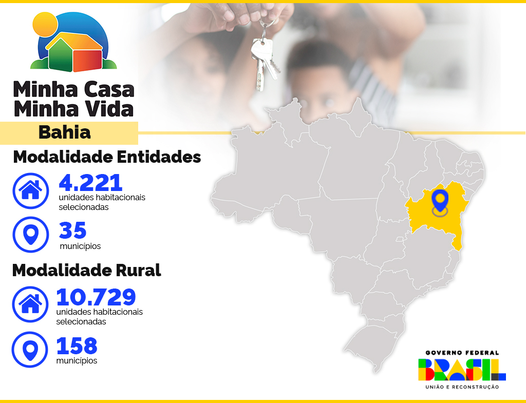 ABahia foi contemplada com 14.950 unidades habitacionais do Minha Casa, Minha Vida nas modalidades Rural e Entidades. O resultado da seleção foi anunciado pelo Governo Federal na última quarta-feira, 10 de abril. Essas modalidades garantem moradia tanto para comunidades urbanas organizadas quanto para grupos específicos, como agricultores familiares, povos indígenas, comunidades remanescentes de quilombos rurais e povos tradicionais que residem em áreas rurais.