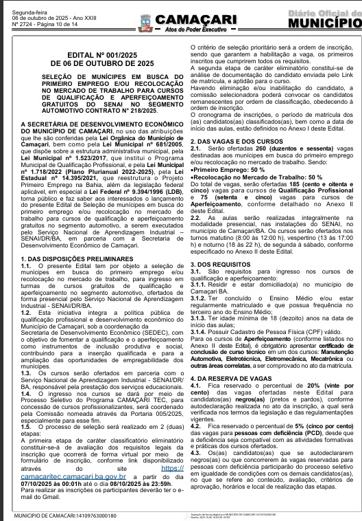 A inscrição ocorrerá de forma virtual por meio de formulário de inscrição, conforme link disponibilizado do site https:// camacaritec.camacari.ba.gov.br a partir do dia 07/10/2025 às 00:01h até o dia 08/10/2025 às 23:59h. Para realizar as inscrições os participantes deverão ter o e mail do Gmail.