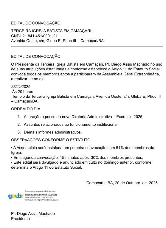 • Edital de convocação da Terceira Igreja Batista de Camaçari